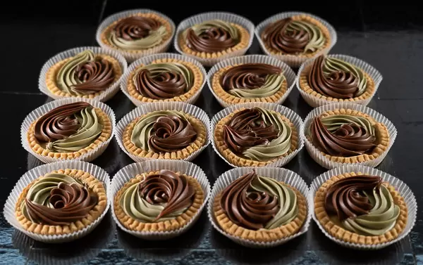 Tartelle di pasta frolla farcite con crema al cioccolato e crema al pistacchio.