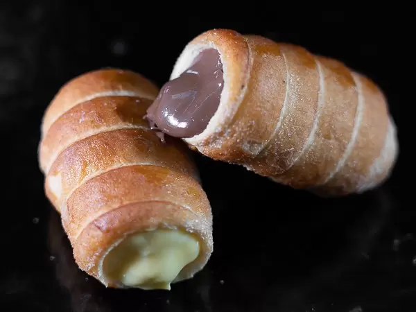 Cannoncini di sfoglia farciti con crema pasticcera e crema al cioccolato.