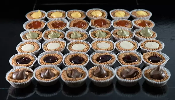 Mini tartellette di pasta frolla variegate, farcite con marmellata di albicocca, marmellata ai frutti di bosco, crema al limone, crema al pistacchio, crema al cioccolato bianco e crema al cioccolato.