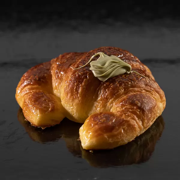 Morbido cornetto di pasticceria curvo farcito con crema al pistacchio di elevata qualità.