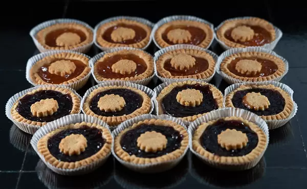 Tartelle di pasta frolla farcite con marmellata di albicocche e frutti di bosco.