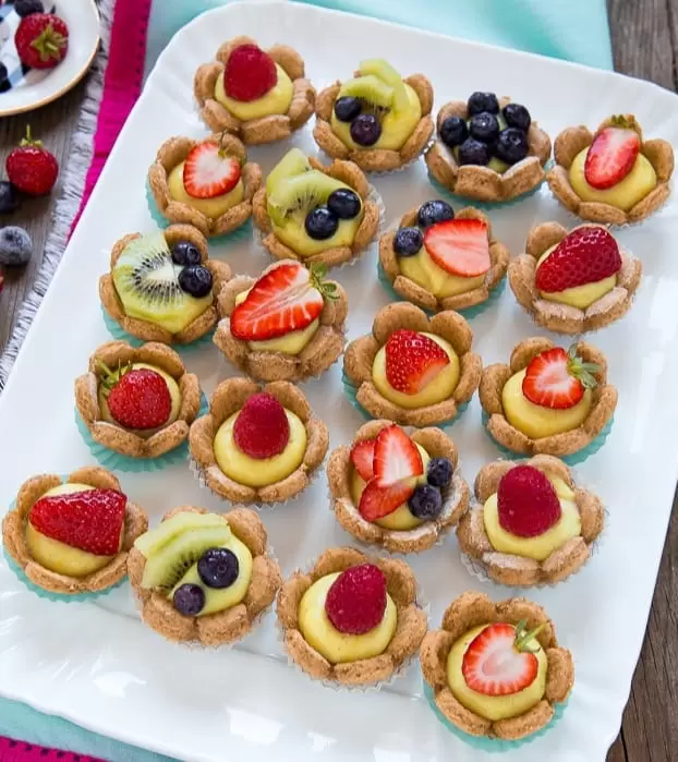 Mini tartellette di pasta frolla variegate, farcite con base di crema pasticcera e frutta fresca