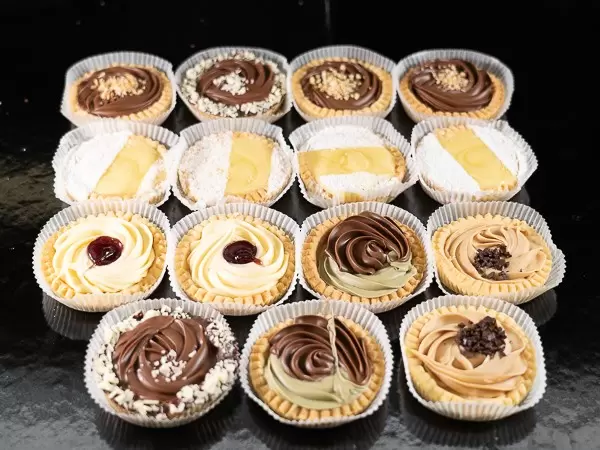 Selezione di varie tartelle di pasta frolla farcite con crema al cioccolato, crema al pistacchio e cioccolato, crema al limone, crema al cioccolato bianco e crema alla nocciola bianca. Guarnite con granella di nocciole, scagliette di cioccolato e marmellata di frutti di bosco. NB solo due pezzi di tale selezione presentano base cacao.