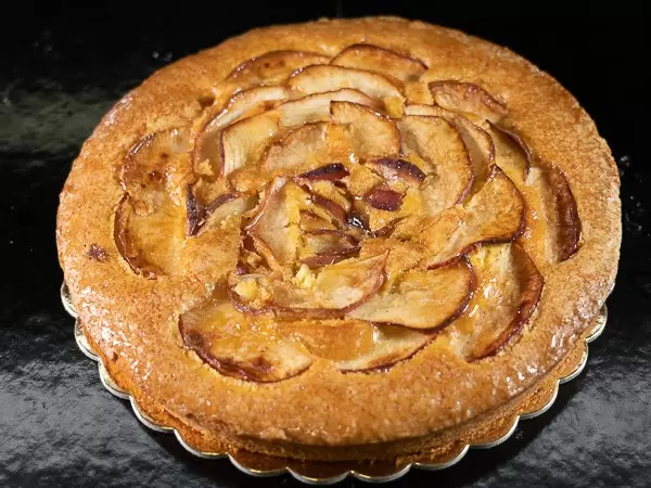 Un classico della tradizione soffice e ricca di gusto. Decorata con sottilissime fette di mela e gelatina di albicocche.