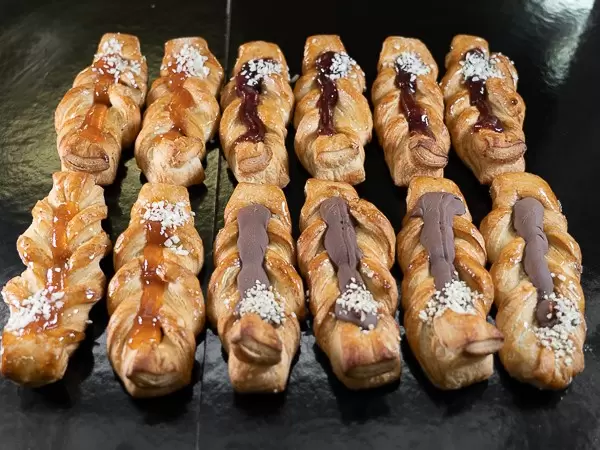 Fragranti treccine pasta sfoglia farcite con marmellata di albicocche, marmellata ai frutti di bosco e crema al cioccolato.